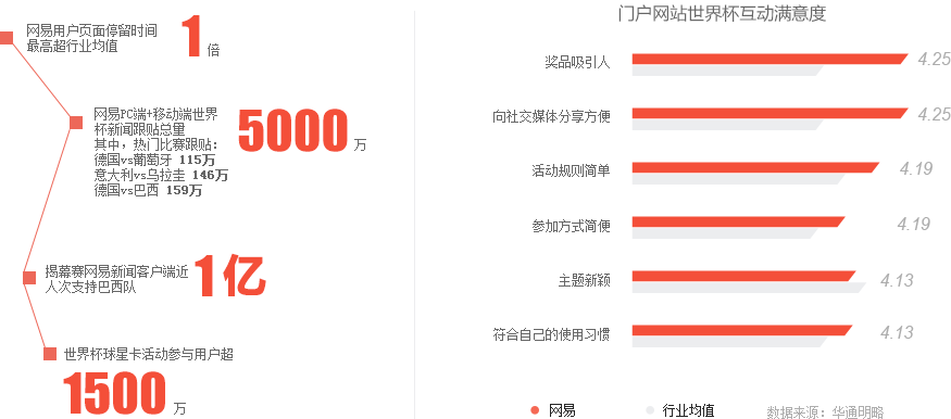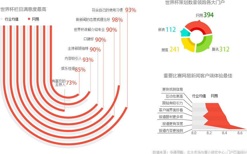 世界杯期间网易以近四百个高水准策划领跑各大网媒,以图文、视频等多种方式深度剖析世界杯赛场内外。其中,独创的世界杯头条看板、足球模块设计以其便捷的阅读体验、充满趣味的互动体验获得网友最高认可。[更多]
